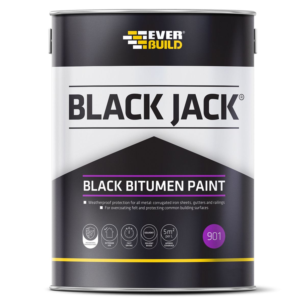 Everbuild¨ Black Jack¨ 901 is a solvent-based, full-bodied black bituminous paint. It dries to form an odourless and taint free black film that provides waterproof, weatherproof and corrosion-resistant protection to all metals and common building surfaces.