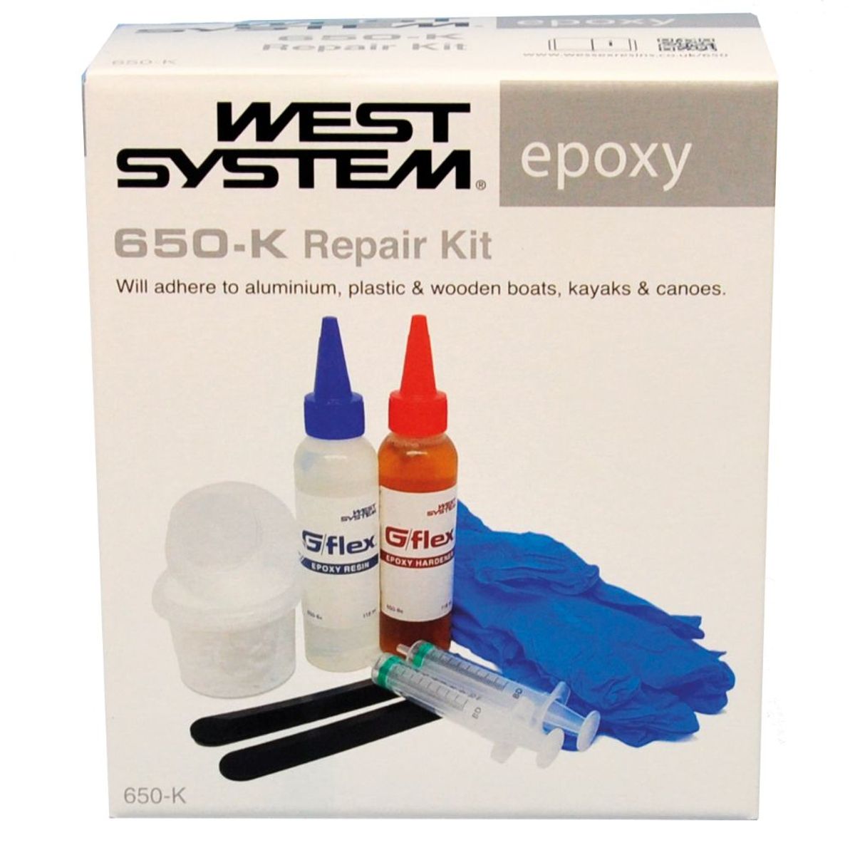 West System 650-K G/Flex epoxy kit contains: 118ml G/flex 650 resin, 118ml G/flex 650 hardener, 2 reusable mixing stick/applicators, 2 x 12cc syringes, 4 g-adhesive filler, 4 mixing cups, 1 pair of disposable neoprene gloves, 4 alcohol cleaning pads and complete handling and repair instructions.