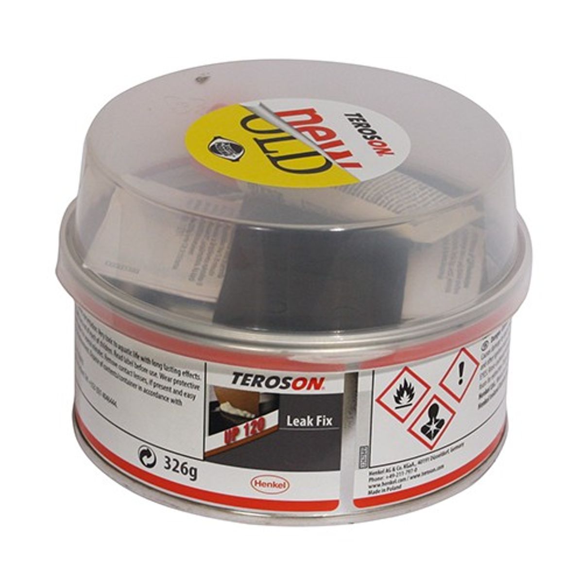 Teroson Up 120 Leak Fix 326g is an all purpose, emergency unsaturated polyester body filler also known as “Plastic Padding Leak Fix”. This 2-part filler is resistant to oil, water, most common chemicals and high temperatures. It is used for repairs to gasoline tanks, leaking pipes, radiators, etc. Suitable substrates are steel, aluminium, galvanised surfaces, glass fibre, copper and tin.