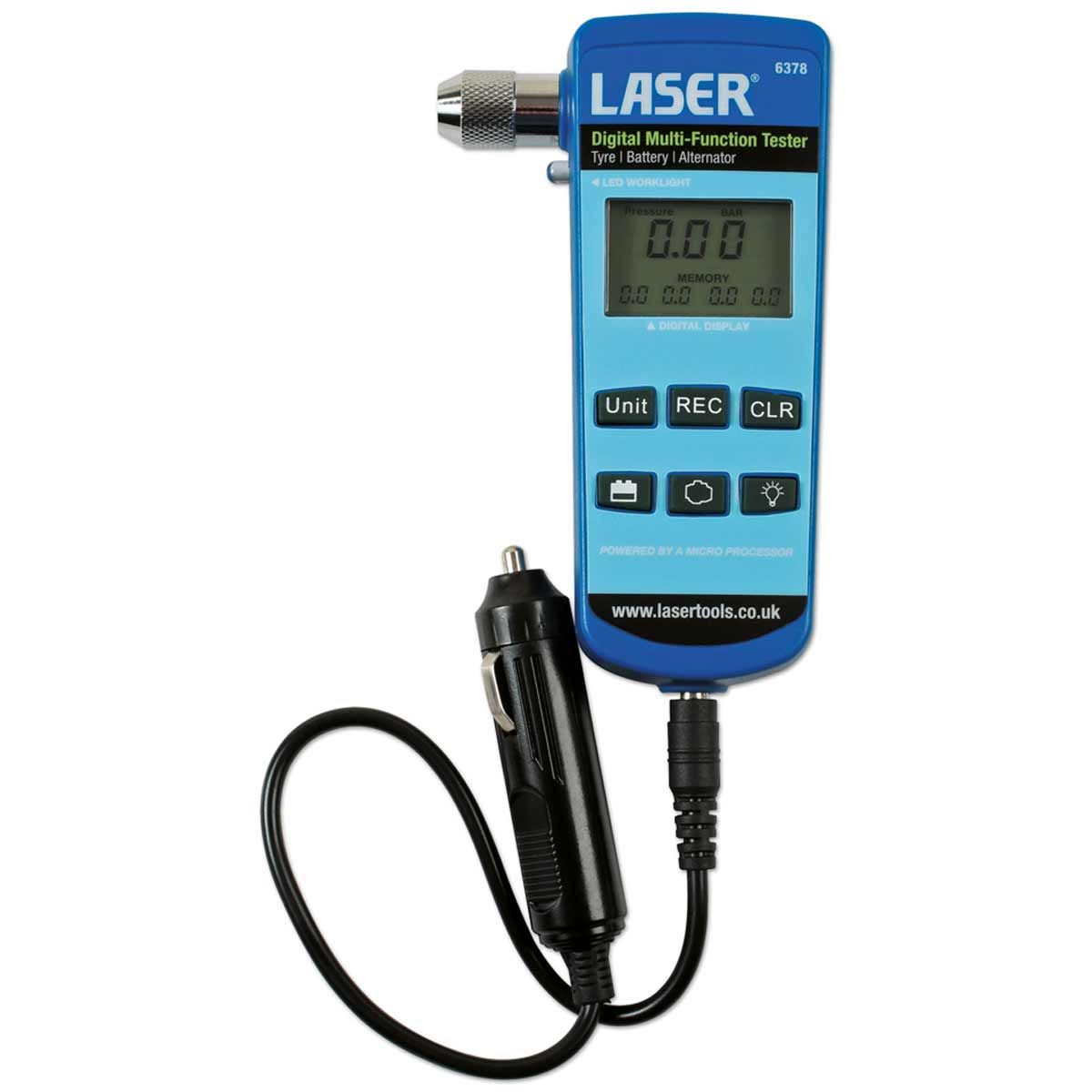 A portable multi-use meter for checking essential items on vehicles. Ideal for both workshop and home use as it allows for easy and rapid testing of tyre pressures, battery status and alternator function. Includes tyre pressure gauge with function to record the readings.