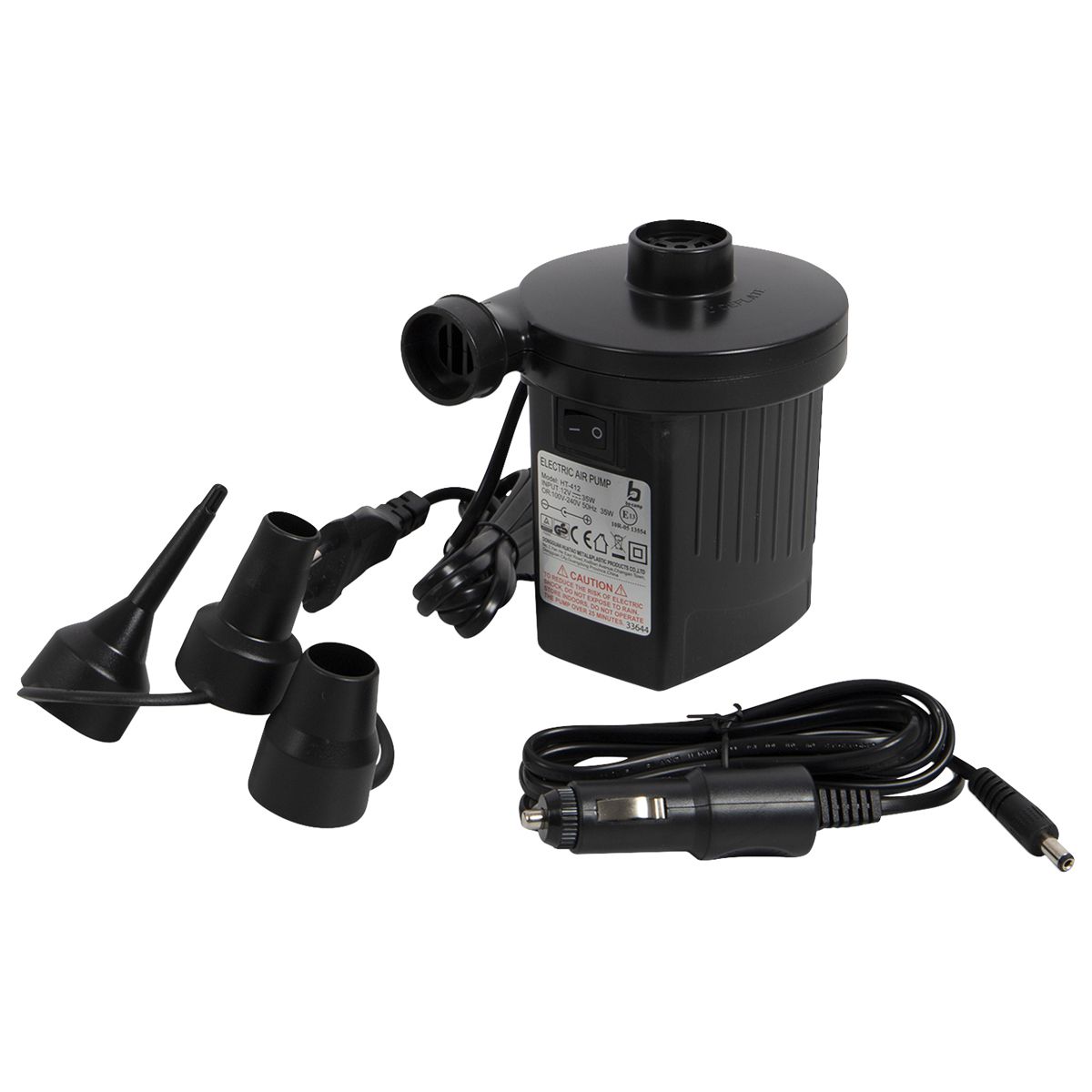 An electric pump for inflating and deflating an air mattress, inflatable boat, toys, etc. Suitable for a 12 Volt and a 230 Volt connection. This pump has an air flow of 230 litre per minute. Comes complete with reducers and adapters.