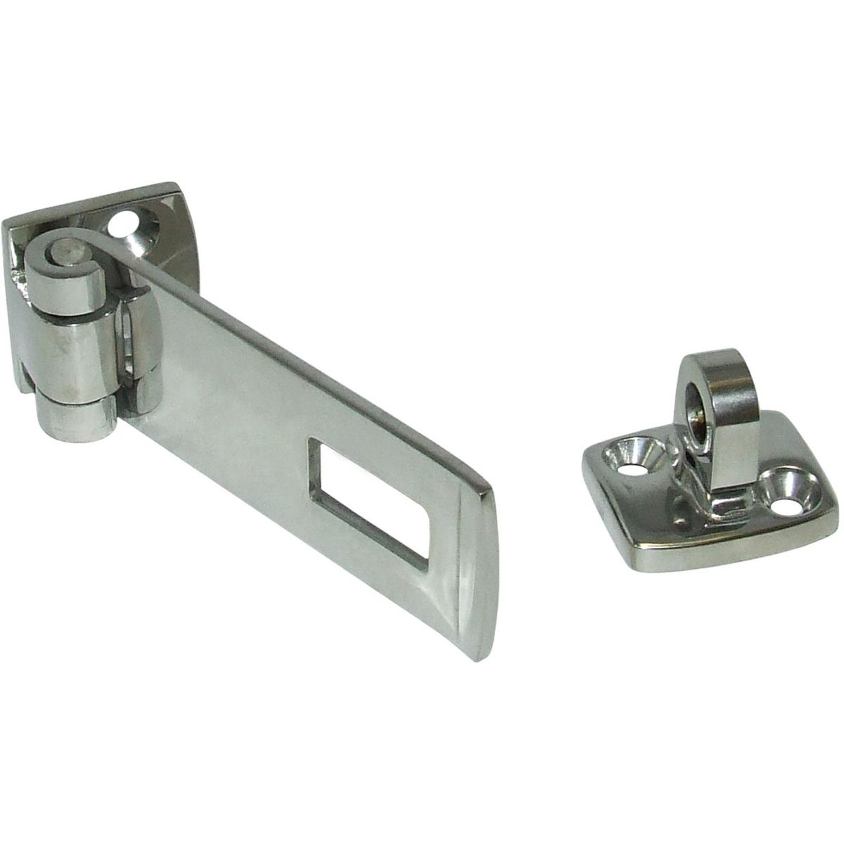 A beautiful two part latch, precision cast in stainless steel AISI 316 for marine applications, and then mirror polished. The screw down mounting foot has a hinged folding catch which fits over the swivel eye end, providing a facility to lock the latch into place. Lock not supplied.
