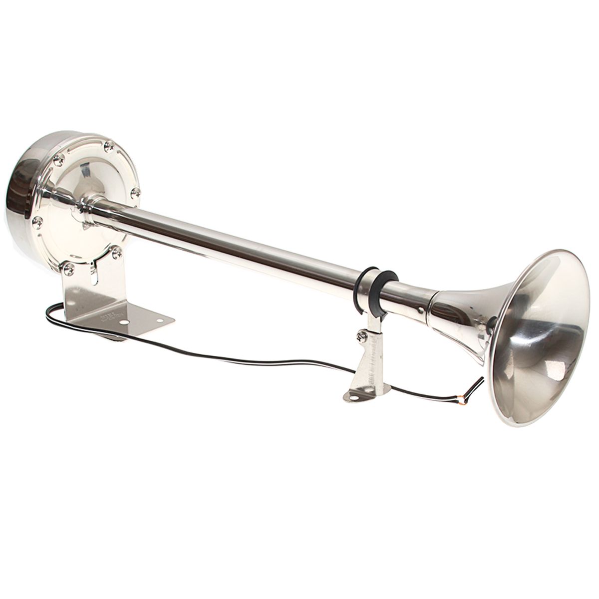 Electric single trumpet horn made from stainless steel. This horn is suitable for 12V systems and features one high pitch horn. The trumpet horn has an output of 115dB and measures 400mm by 102mm by 127mm.