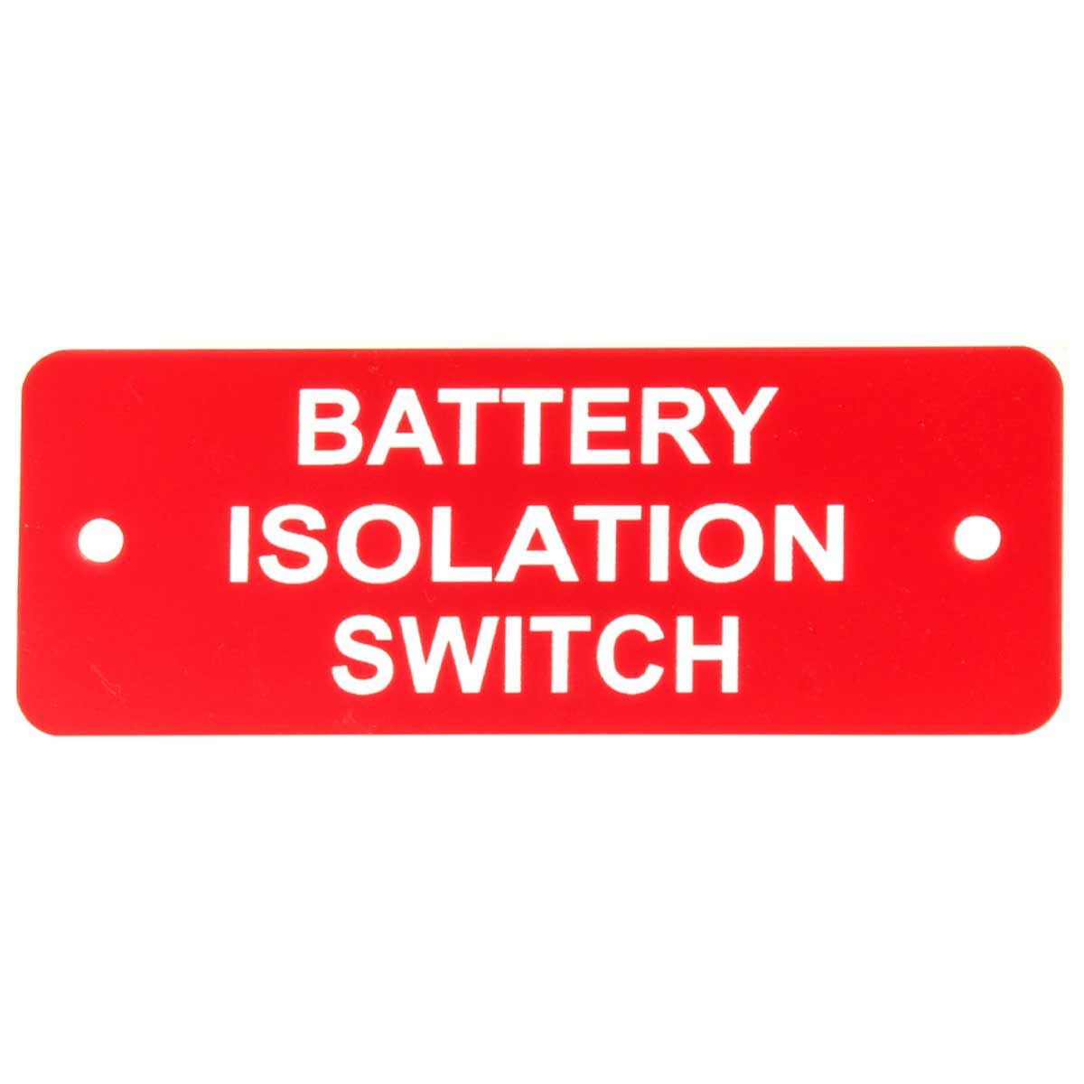 Red ‘Battery Isolation Switch’ label with white engraving and two drill holes.