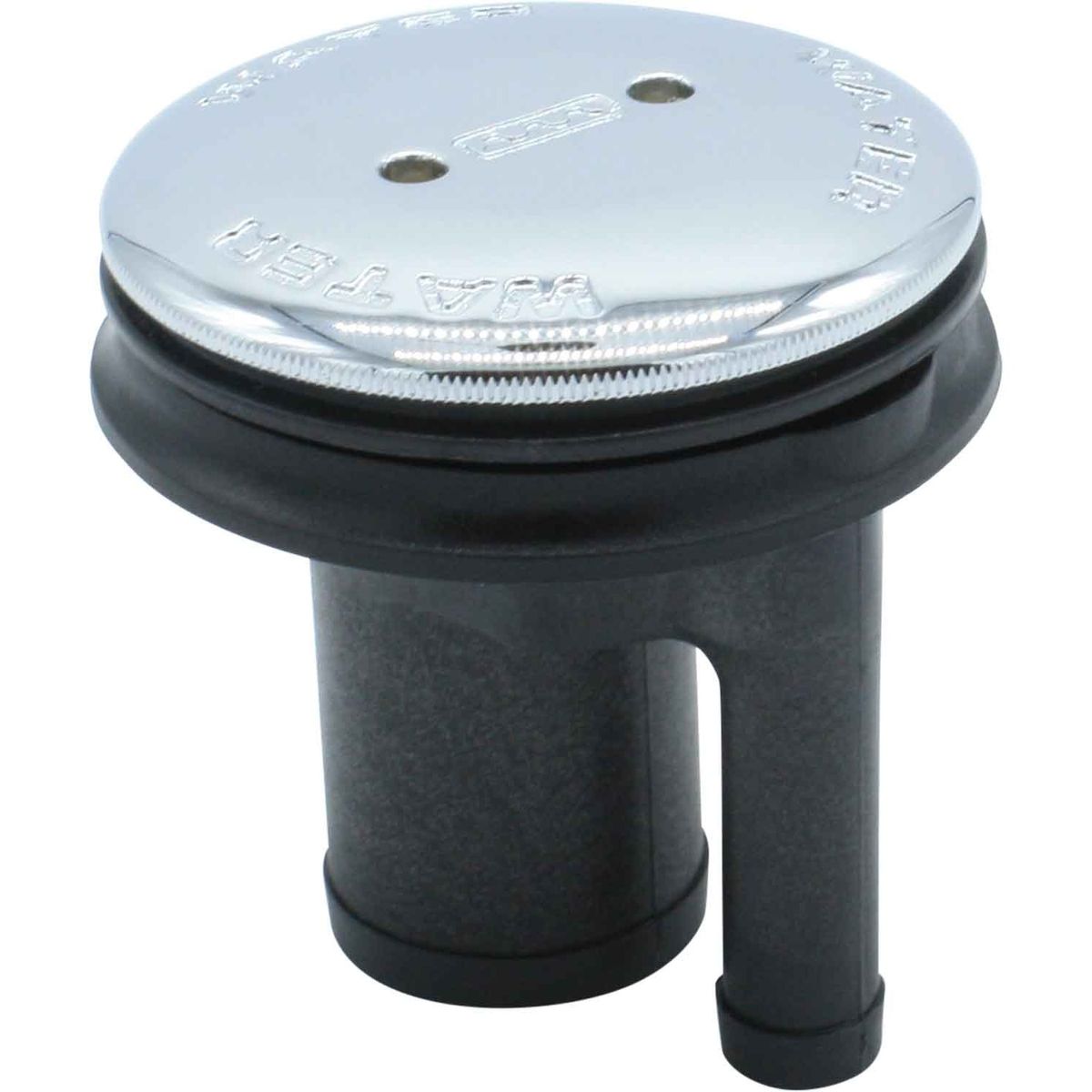 The Perko quality water deck filler with combined vent is constructed from a straight black plastic body and a chrome plated bronze cap.