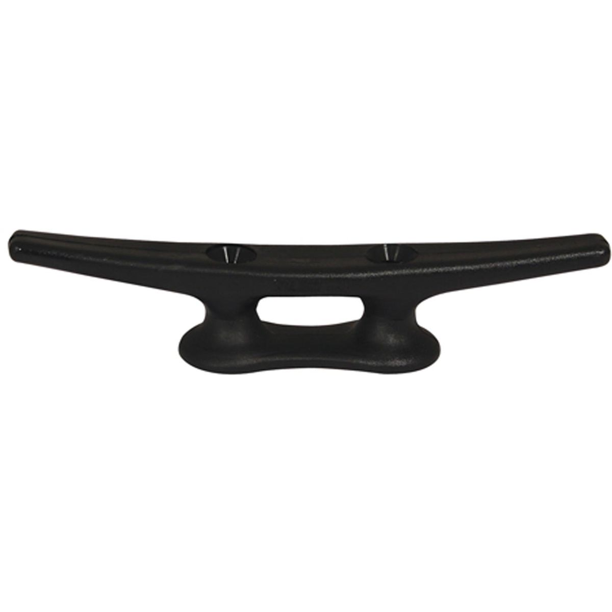 Trem deck cleats constructed from black nylon. Deck Cleats are designed for attachment to the deck or other flat surface, having both a wide base attaching with 2 screws, and a hole in the base so a spliced eye can be run through it and slipped over the Cleat.