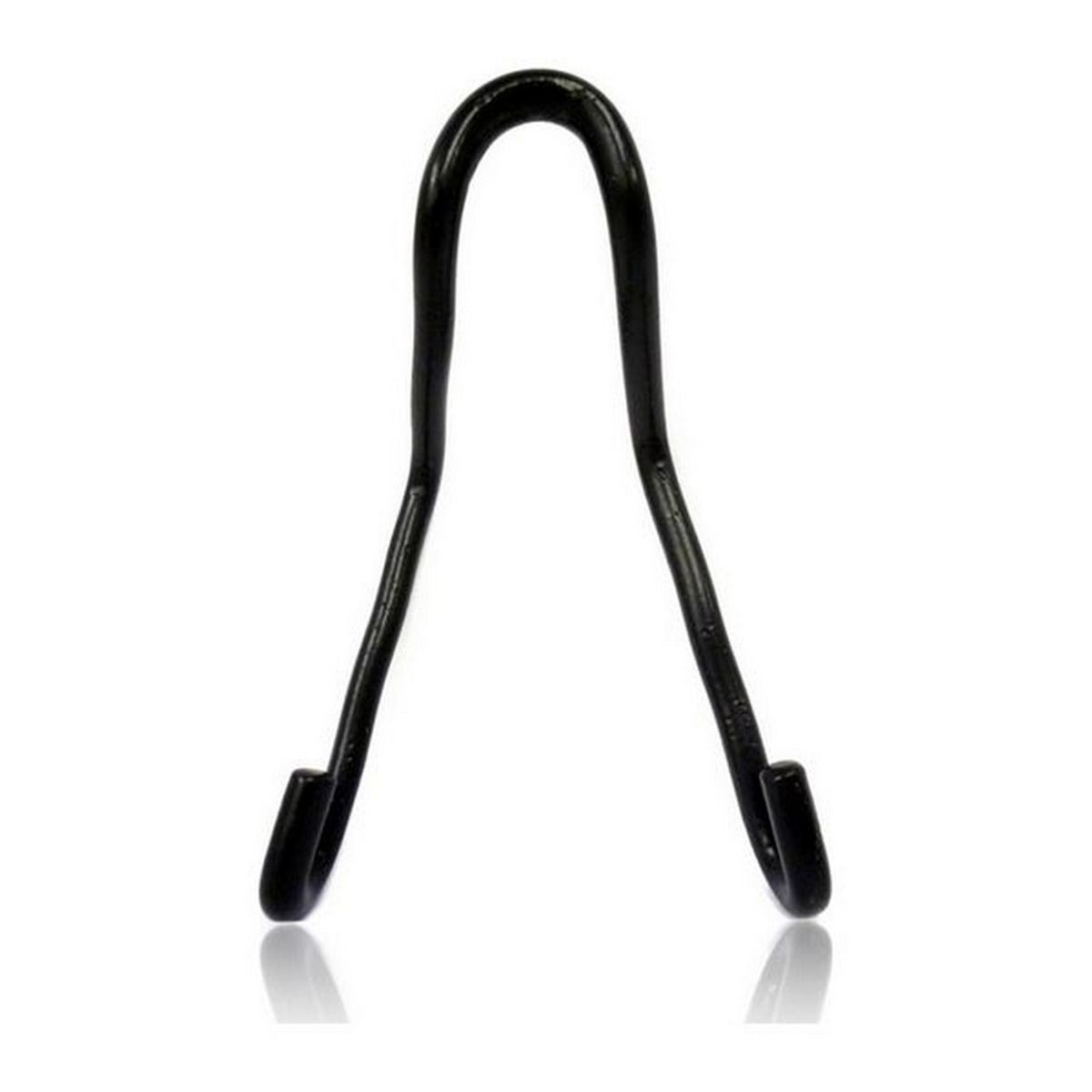 Black fender hook made of powder-coated bent steel rod, suitable for use with boat side fenders.