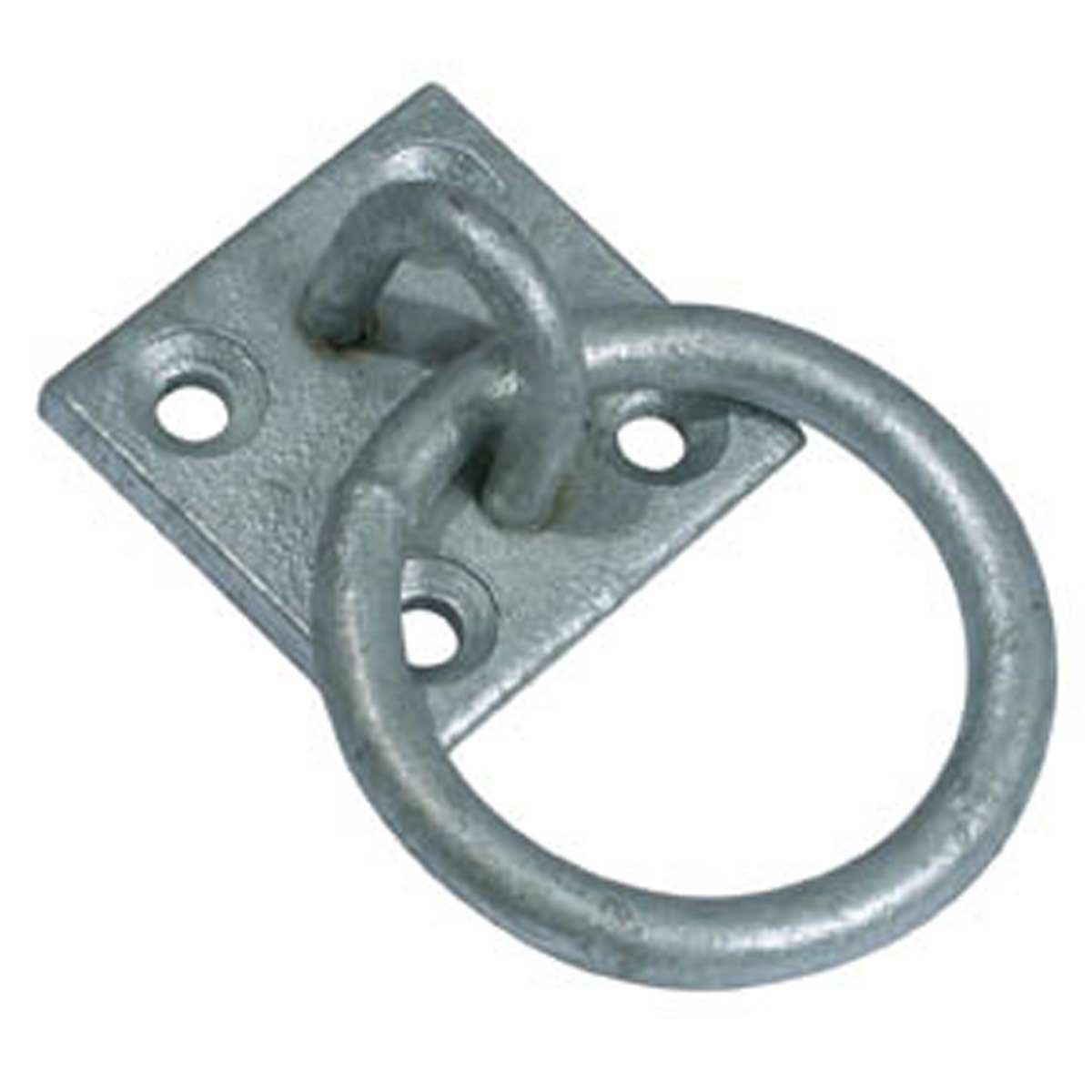 AG galvanised steel binnacle ring eye plate suitable for mooring posts and attaching mooring lines and fender ropes etc to. The square plate measures 50 x 50mm, with 4 predrilled fixing holes, and the ring is 8mm x 50mm inner diameter.