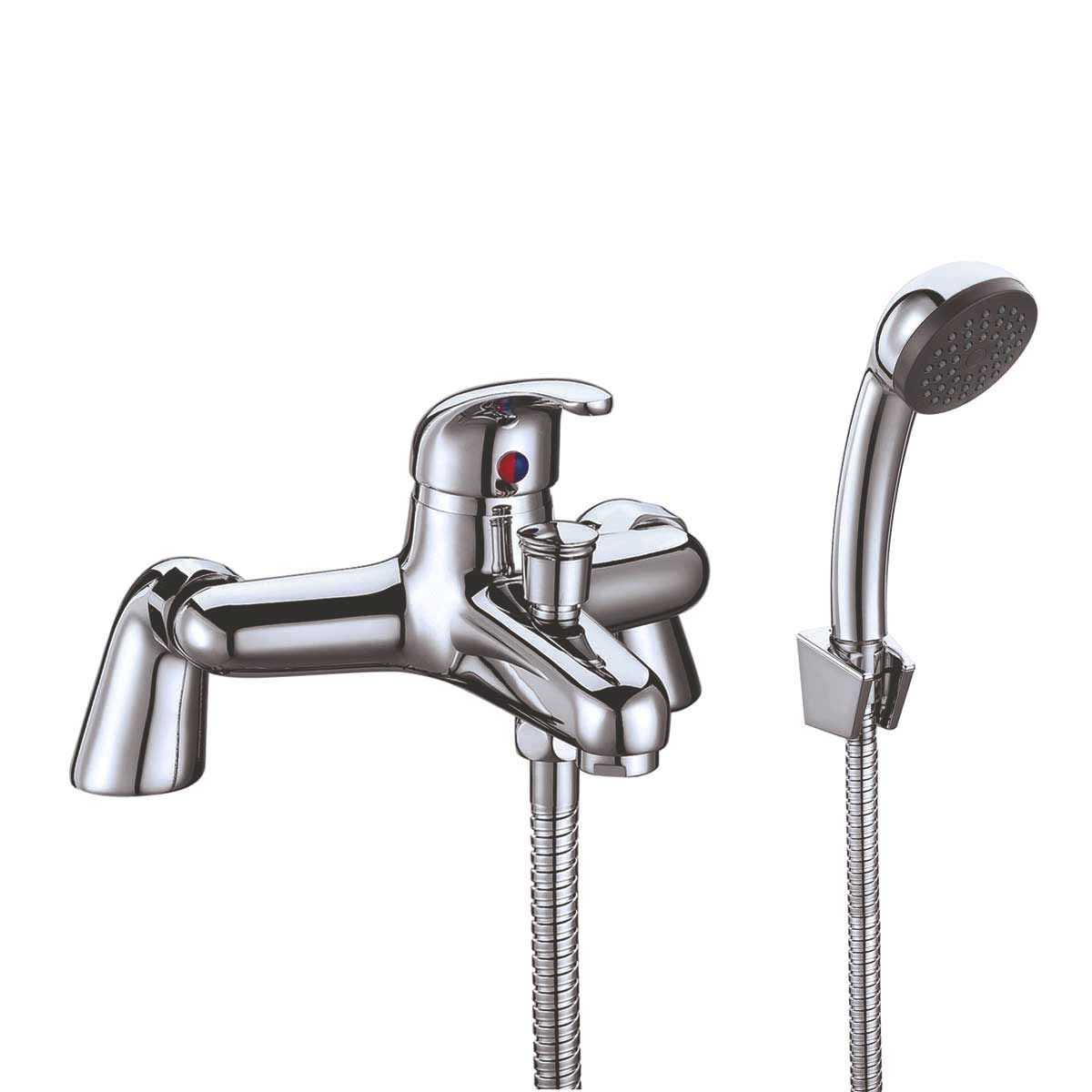 Bath shower mixer with shower kit and wall bracket constructed from high quality brass with a sleek chrome finish.