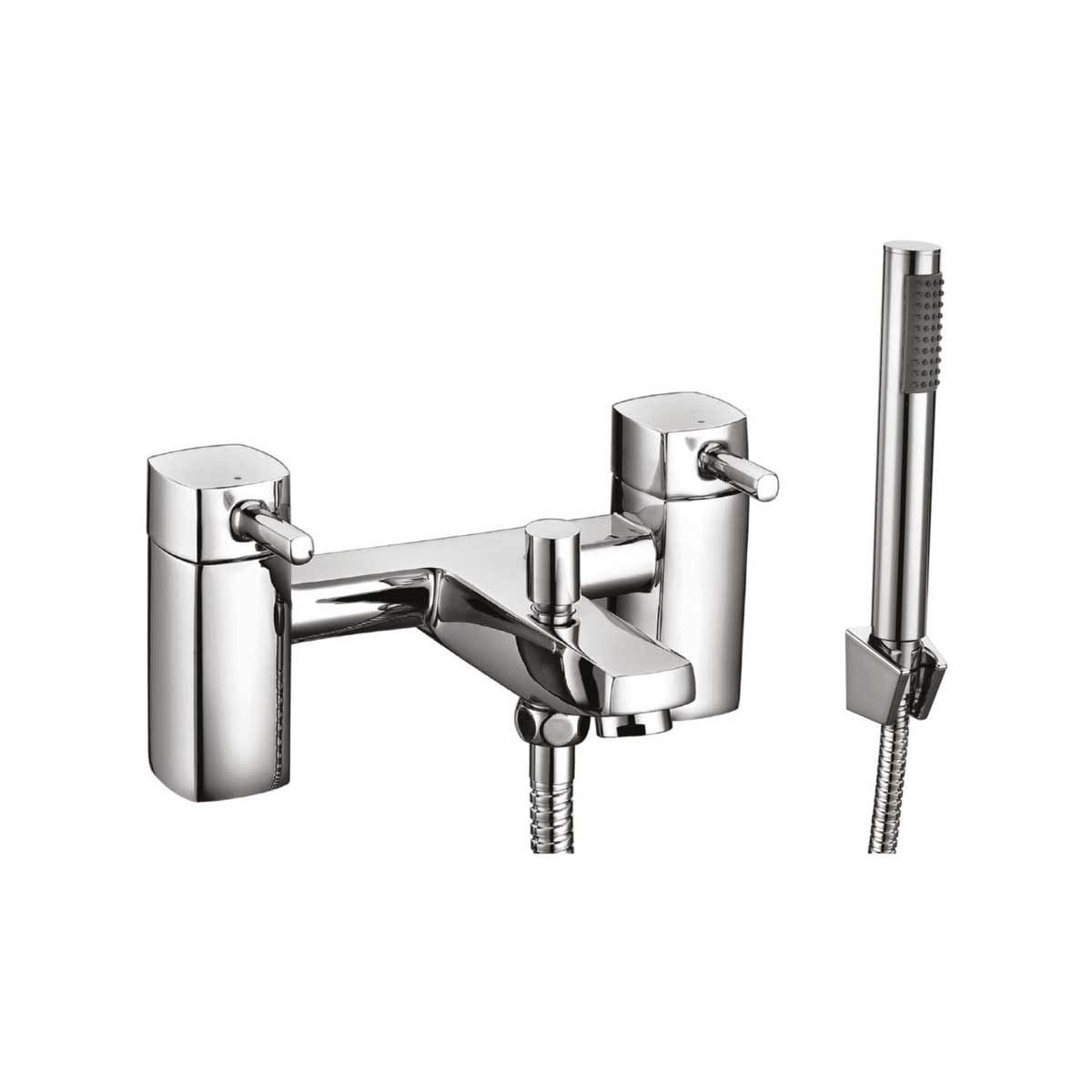 Chrome bath shower mixer with a simple soft square design, practical lever handles and simple spout.