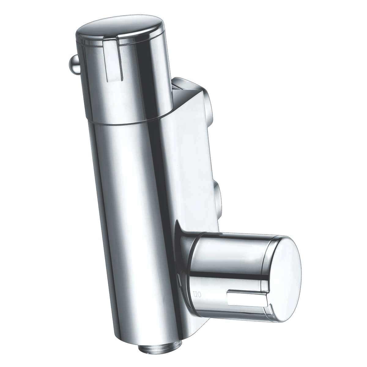 Thermostatic vertical shower valve featuring an easy-to-use knob handle and chrome finish.