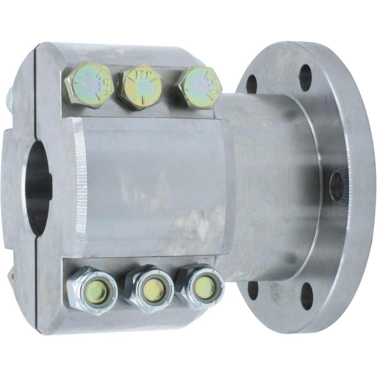 This clamp on split half coupling is machined from solid steel and mates with the gearbox output coupling to connect a 45mm diameter metric boat propeller shaft to the gearbox, usually via a flexible coupling.
