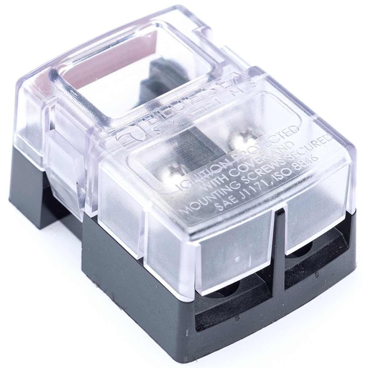 Blue Sea fuse block with a snap-on terminal cover which insulates all conductive parts, meeting ABYC/USCG requirements. The terminal screws compress fuse blades within blocks for low resistance connections.