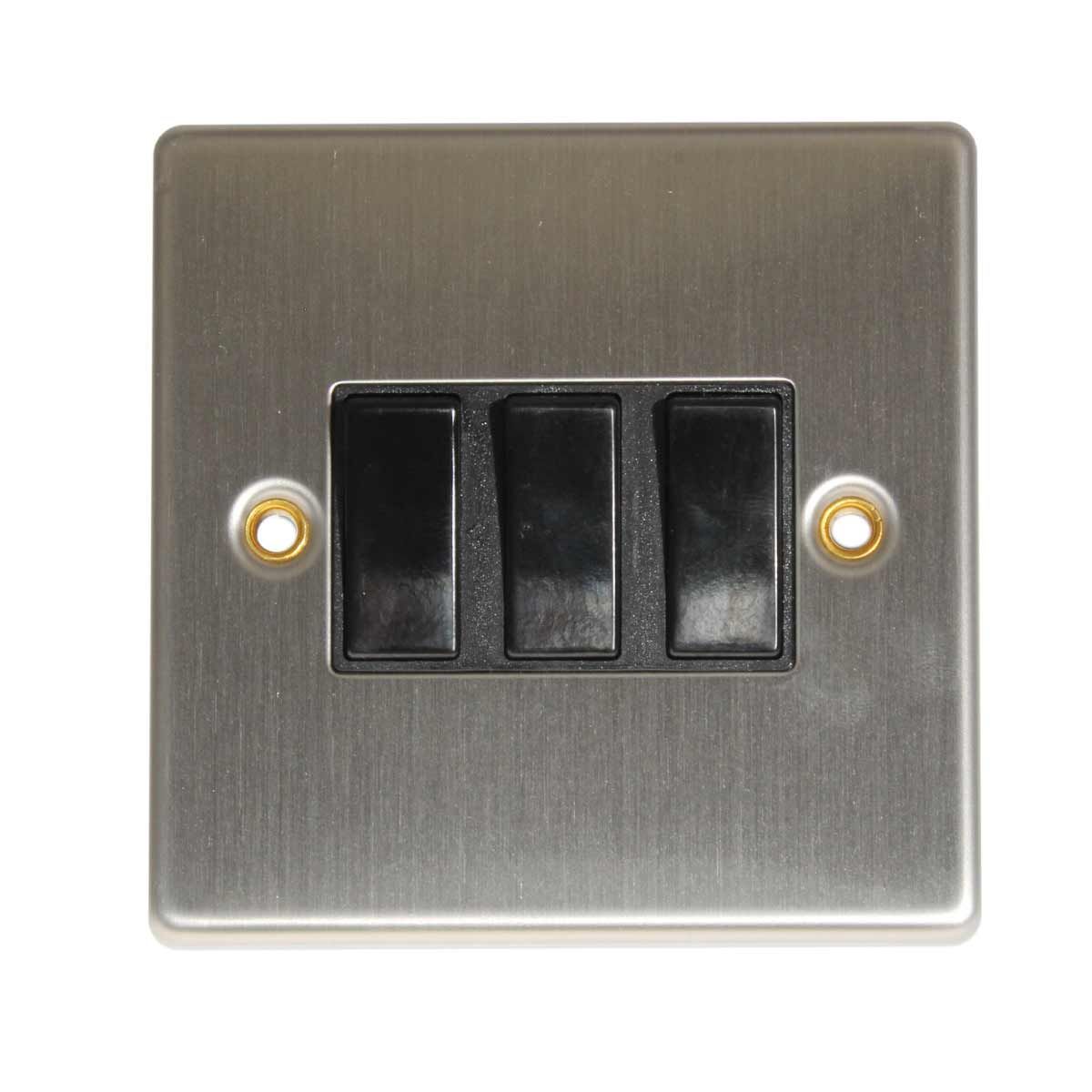 Round Edge 3-Gang Switch in Brushed Steel and Black (2 Way / 10A)