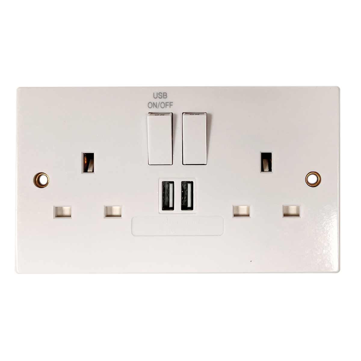 Double switched socket with integrated USB ports, designed for providing traditional electrical outlets and USB charging capabilities.