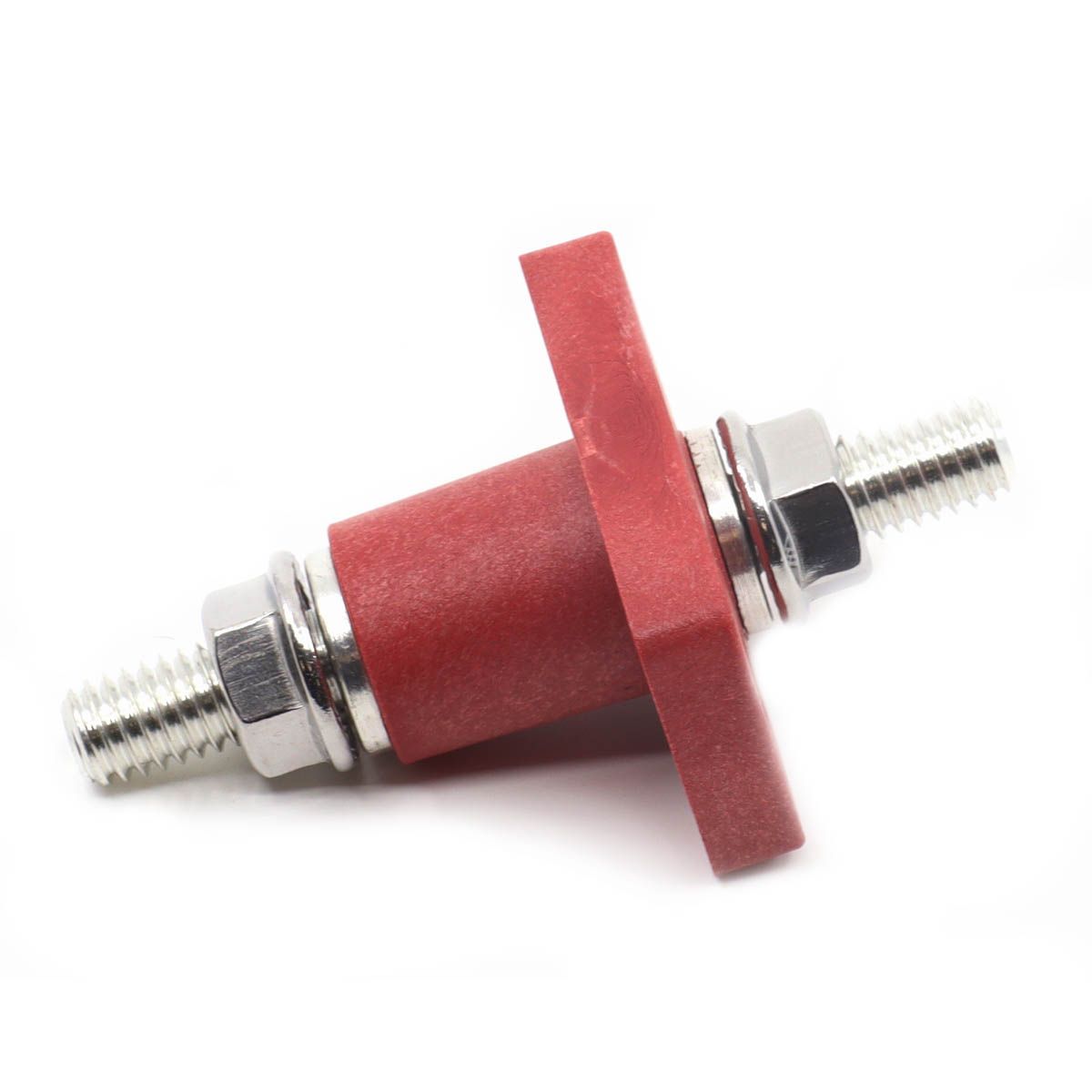 Red terminal feed through connector with 3/8″-16 studs. Sold Singularly.