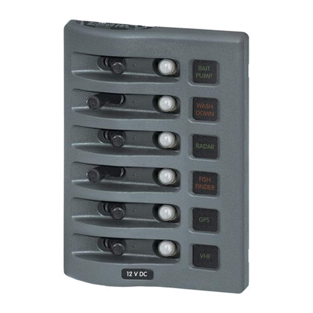 Blue Sea WeatherDeck Waterproof Circuit Breaker Panel 4376 is rated 12 / 24 Volts, has 6 positions and is designed for flybridge and open cockpit applications.
