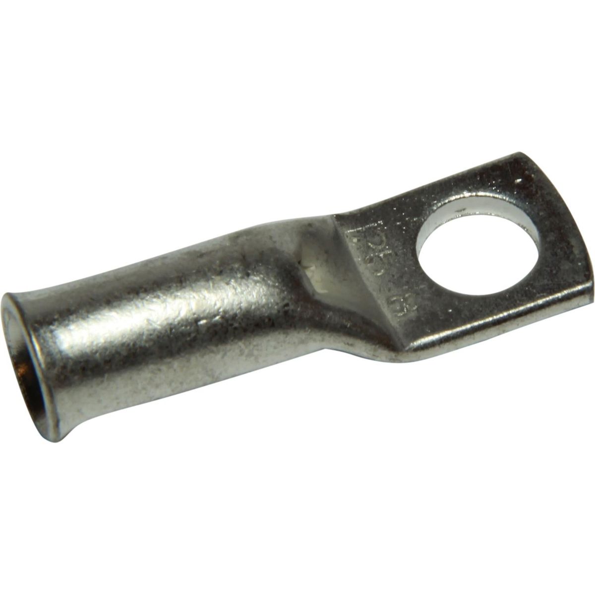 Battery cable terminal eye constructed from tinned copper, part of the Auto Marine range. This terminal uses an eye fixing to secure to battery studs and a cable entry suitable for crimping or soldering. Features an inspection hole at the front of the terminal.