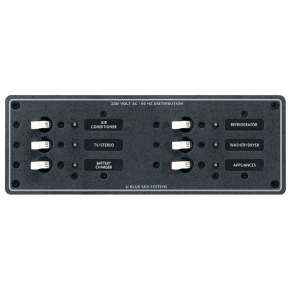 Blue Sea traditional metal 230V AC circuit breaker panel with 6 positions, featuring six 8 amp toggle circuit breakers.
