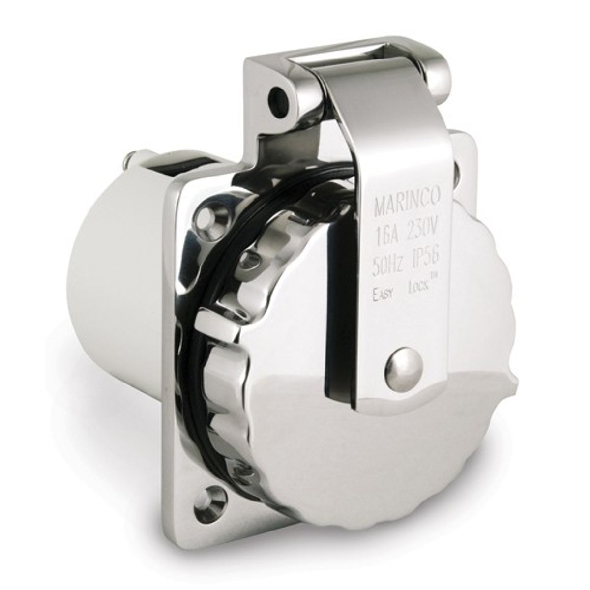 Marinco 303SSEL-BXPK stainless steel shore power inlet featuring the Easy Lock system and rear safety enclosure with strain relief. This shore power inlet socket is rated 16A and 230V and made of marine grade stainless steel 316. The cap has a soft touch design and is IP56 rated. CE.