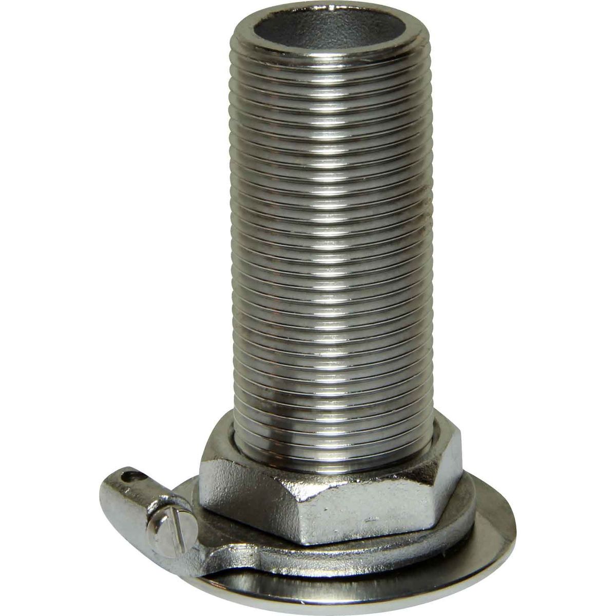 Osculati threaded skin fitting made from stainless steel 316. This material is the marine grade stainless steel making it suitable for exposure to sea water. This skin fitting connects to a threaded pipe and is designed for through hull applications. The skin fitting is supplied with a locking nut and a bonding washer.