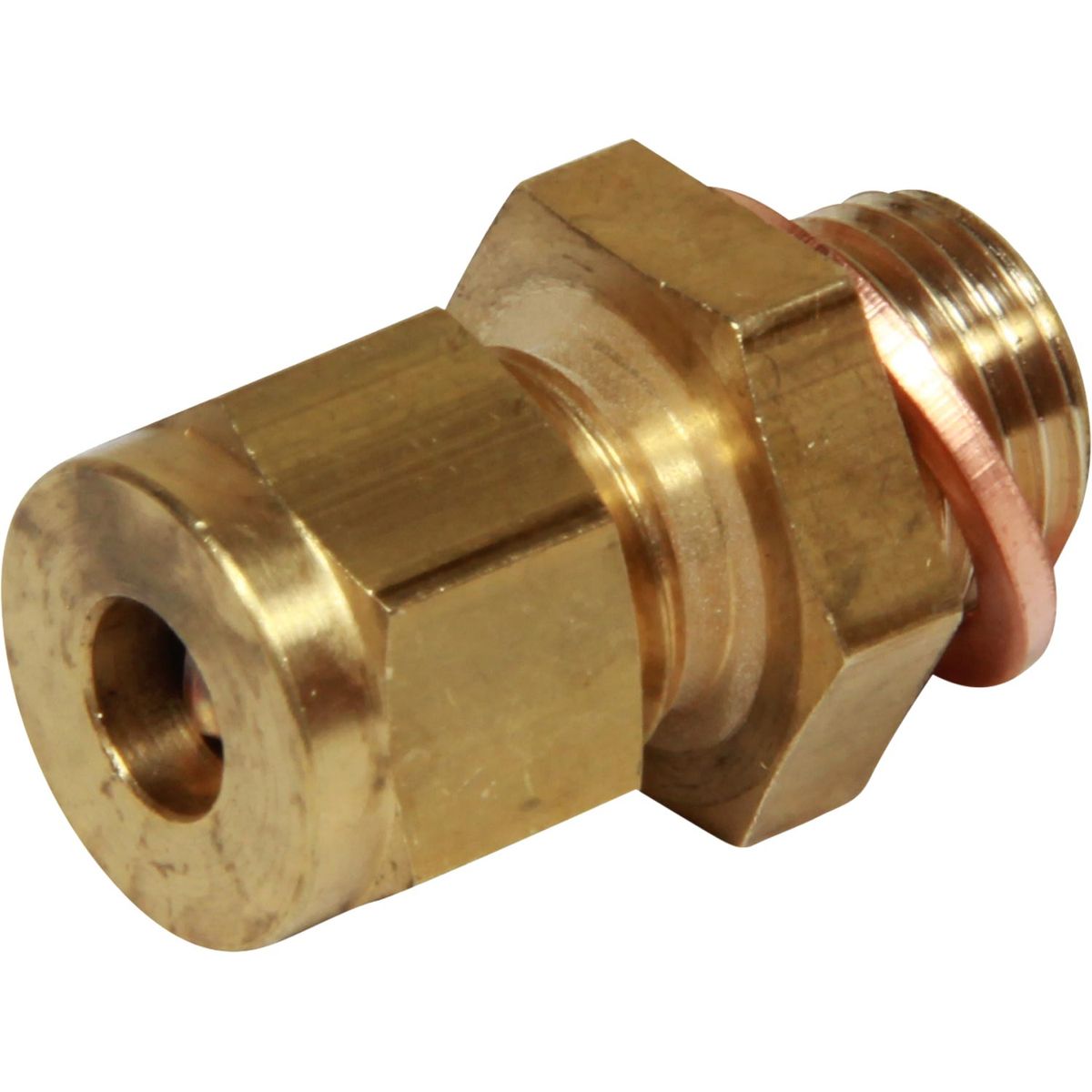 Union adaptor fitting used with CAV fuel filters, supplied with compression nut & olive. The CAV filter union fitting features a 1/2″ UNF male thread to a 1/4″ OD pipe compression connection.