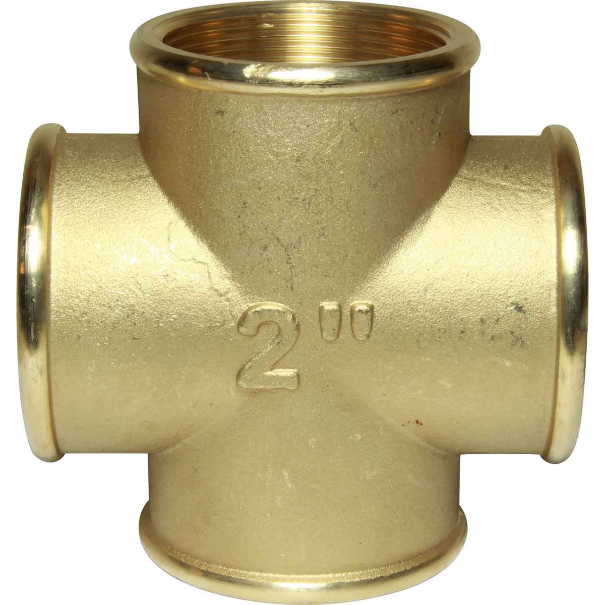 Maestrini cross fitting made from brass. This cross fitting is used to connect four pieces of equal sized pipe.