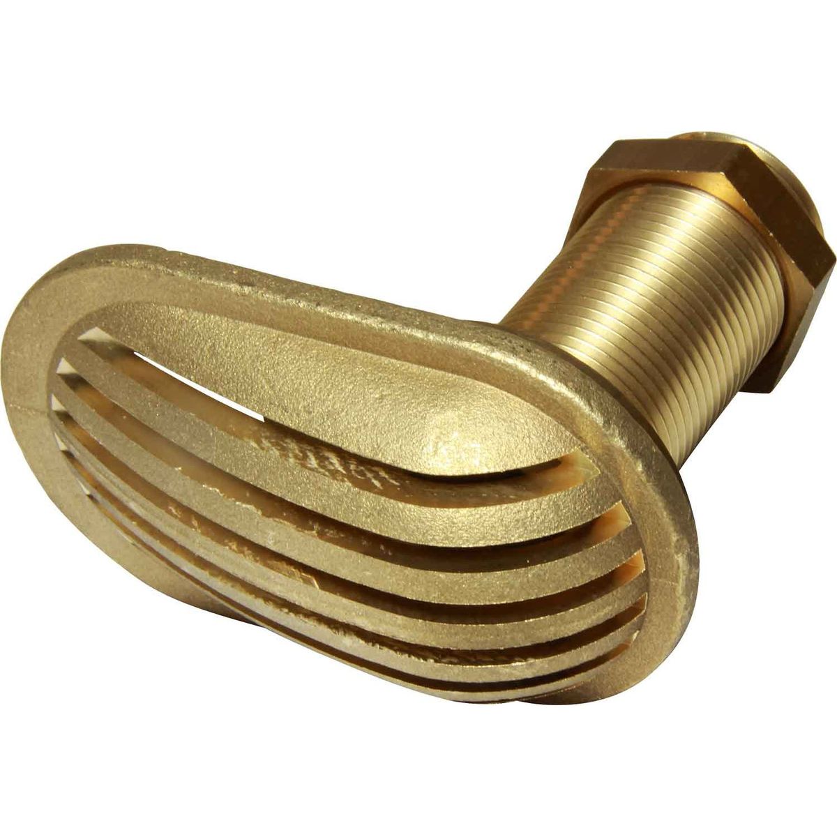 Maestrini scoop strainer made from brass, with a full slotted grating. This scoop is designed for raw water intake systems, such as those used in static intakes like toilets and gensets. It fits through the hull with the grating on the outside and the male threaded pipe leading inside, usually to a valve to open and close the intake.