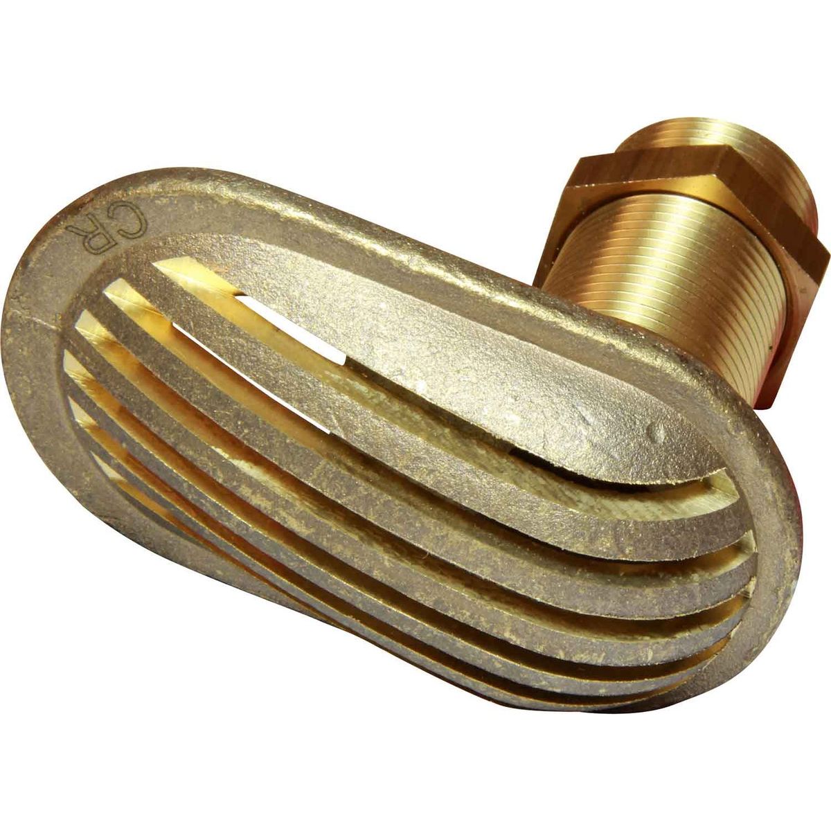 Maestrini scoop strainer made from corrosion resistant brass (also known as CR Brass or DZR), with a full slotted grating. This scoop is designed for raw water intake systems, such as those used in static intakes like toilets and gensets. It fits through the hull with the grating on the outside and the male threaded pipe leading inside, usually to a valve to open and close the intake.
