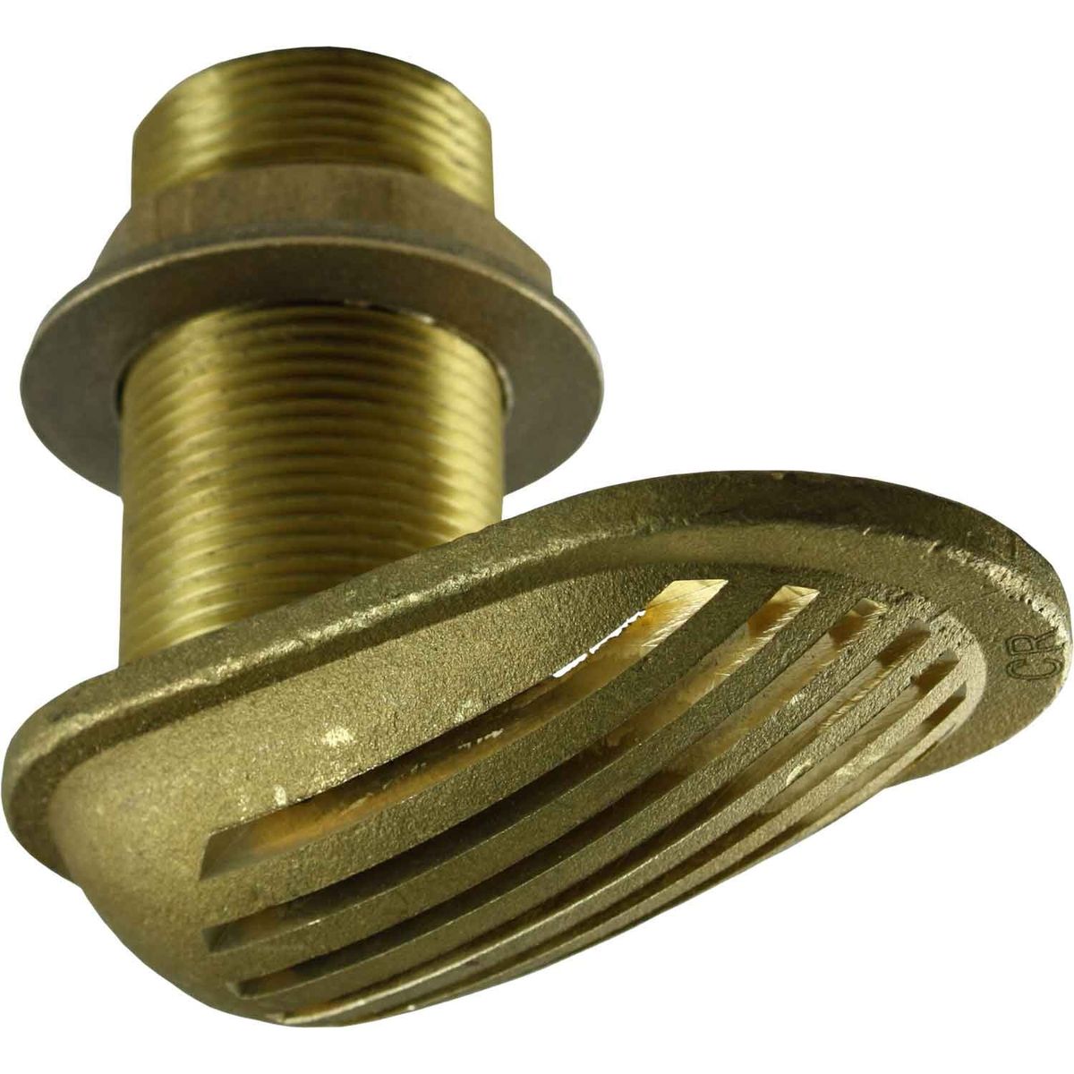Maestrini scoop strainer made from corrosion resistant brass (also known as CR Brass or DZR), with an oval shaped grating. This scoop is designed for raw water intake systems, such as those used for engine coolant. It fits through the hull with the grating on the outside and the male threaded pipe leading inside, usually to a valve to open and close the intake.