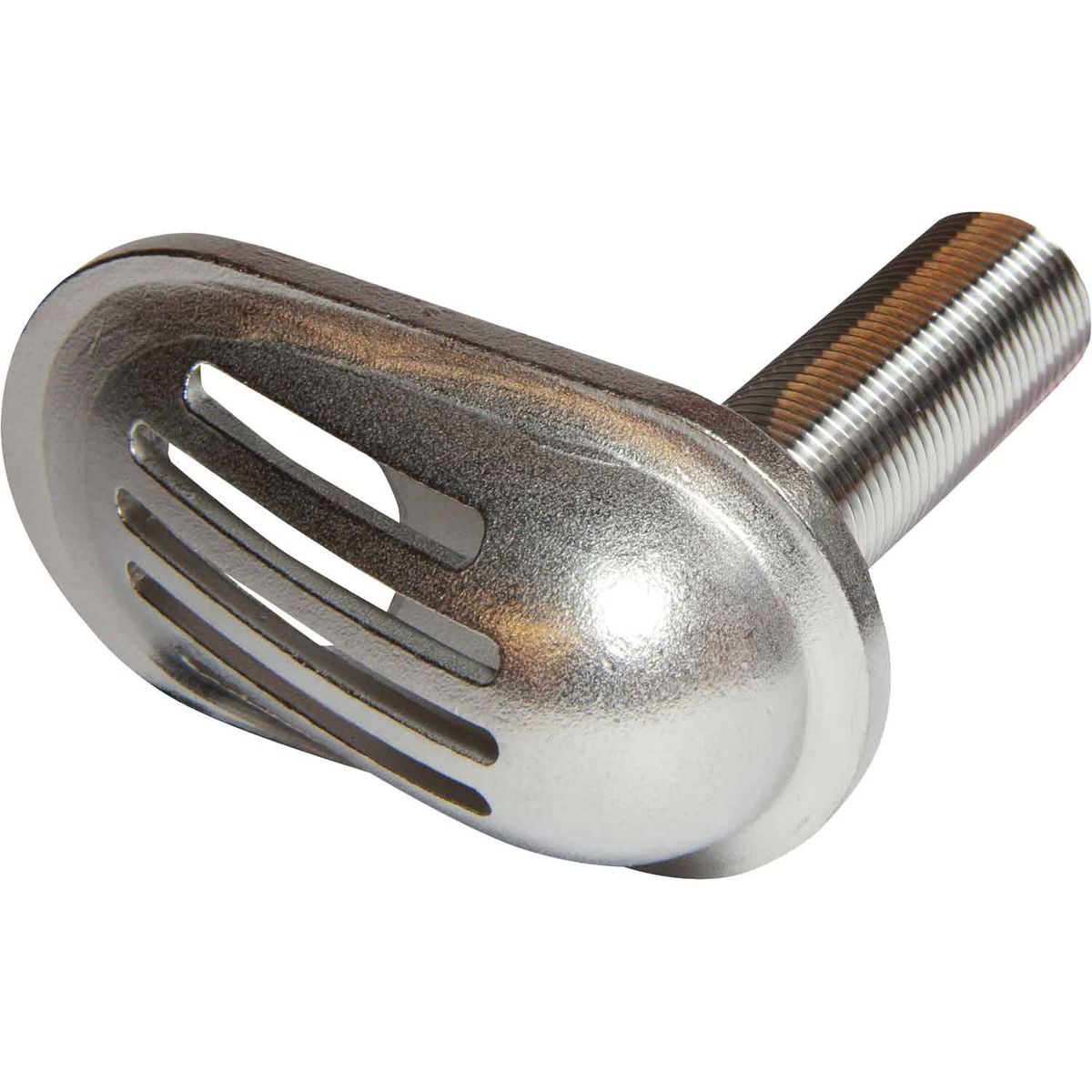 Osculati scoop strainer made from stainless steel 316, with an oval shaped grating. This scoop is designed for raw water intake systems, such as those used for engine coolant. It fits through the hull with the grating on the outside and the male threaded pipe leading inside, usually to a valve to open and close the intake.