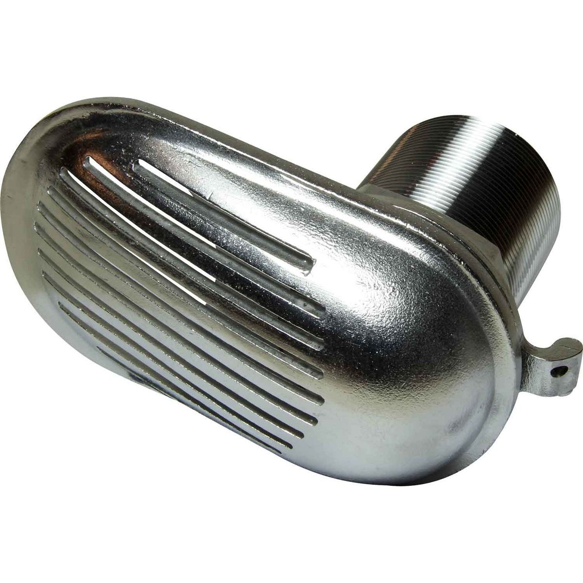 Osculati scoop strainer made from stainless steel 316, with an oval shaped grating. This scoop is designed for raw water intake systems, such as those used for engine coolant. It fits through the hull with the grating on the outside and the male threaded pipe leading inside, usually to a valve to open and close the intake.