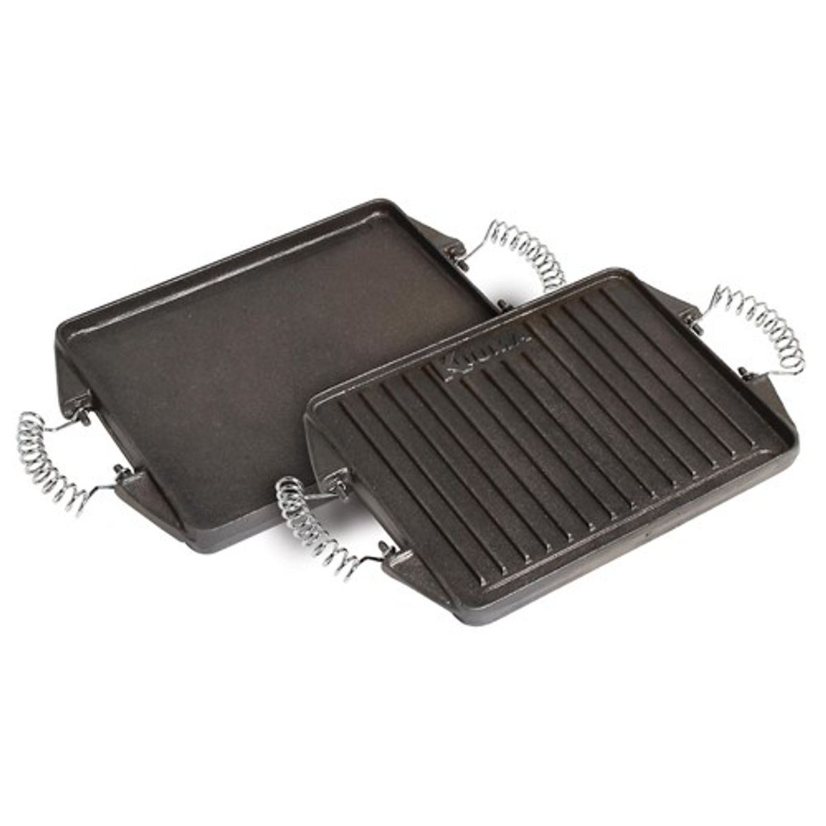 The Cast Iron Griddle is designed for use on your grill at home or camping. The two-sided griddle has a smooth side for cooking pancakes and frying eggs, and a ribbed side for cooking meats. The high quality cast iron griddle evenly distributes heat and becomes seasoned over time with proper use, for added cooking flavour. Convenient built-, stay-cool handles make the griddle easy to use. Measures 12.25″ x 8.25″.