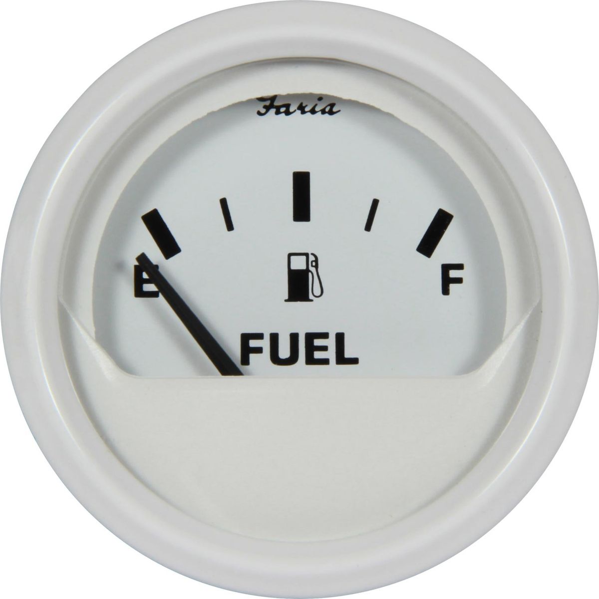 The Faria Beede Dress White style fuel level gauge features a white aluminium bezel, white dial, black pointer and graphics displaying [empty – full], with perimeter back lighting and a flat glass lens.