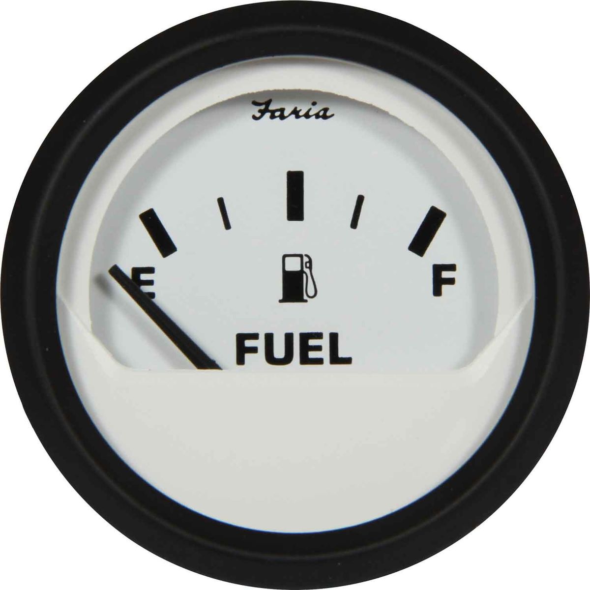 The Faria Beede Euro White style fuel level gauge features a black aluminium bezel, white dial, black pointer and graphics displaying [empty – full], with perimeter back lighting and a flat glass lens.