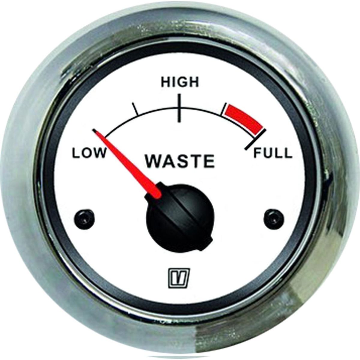 Vetus WASTW is supplied with two bezels as standard, one black and one chrome finished. The dial display shows a full tank, half tank and empty tank, as well as markers for 1/4 and 3/4.