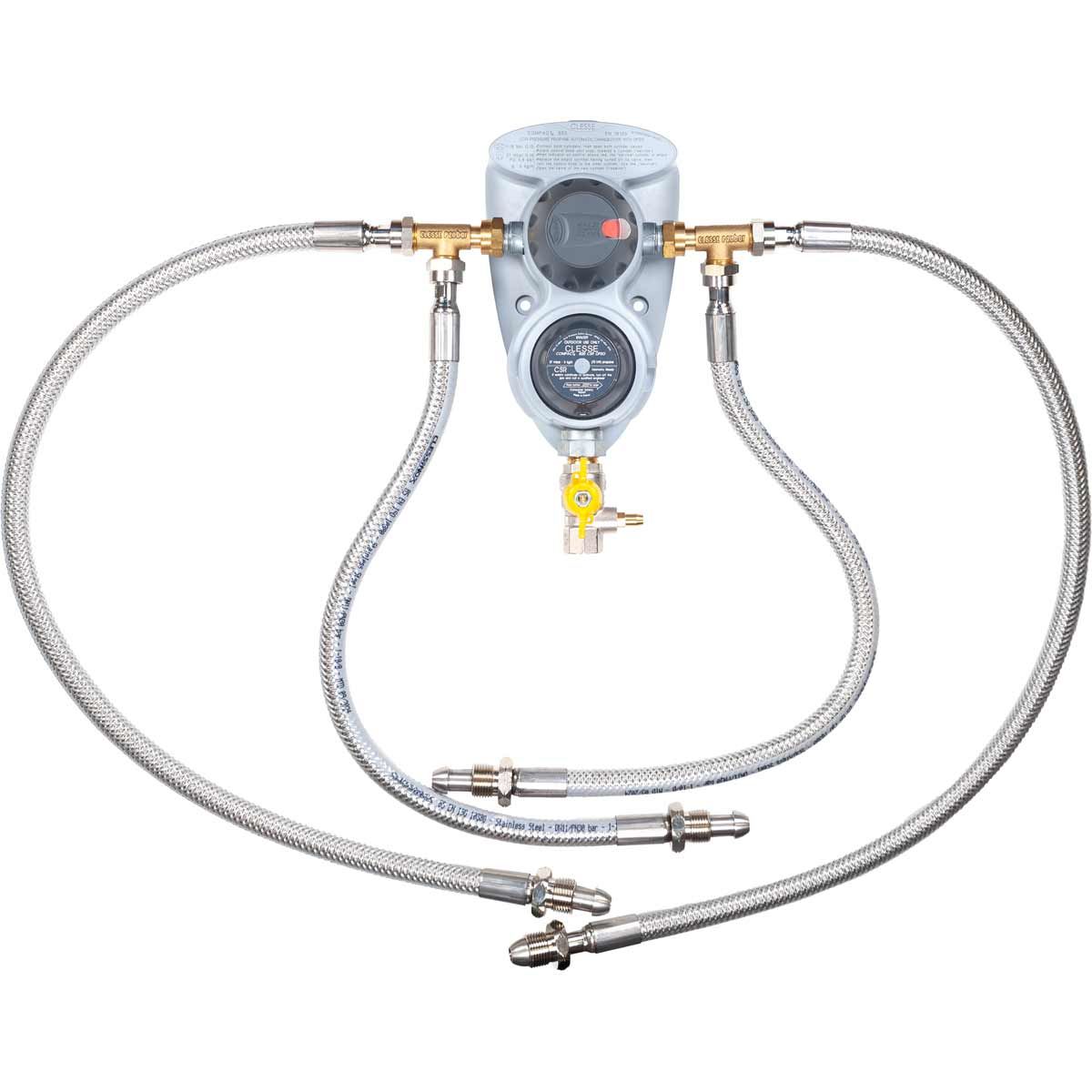 Compact 800 four cylinder automatic changeover with branded Clessinox stainless-steel pigtails and OPSO 37mb 5kg/h. This system incorporates a ÒPush to Set” over pressure safety system with indication, ensuring reliable pressure delivery and consumer safety. There is no need to remove caps or pull resets Ð just a clear ÒPush to Set” device cancelling the red trip indicator.