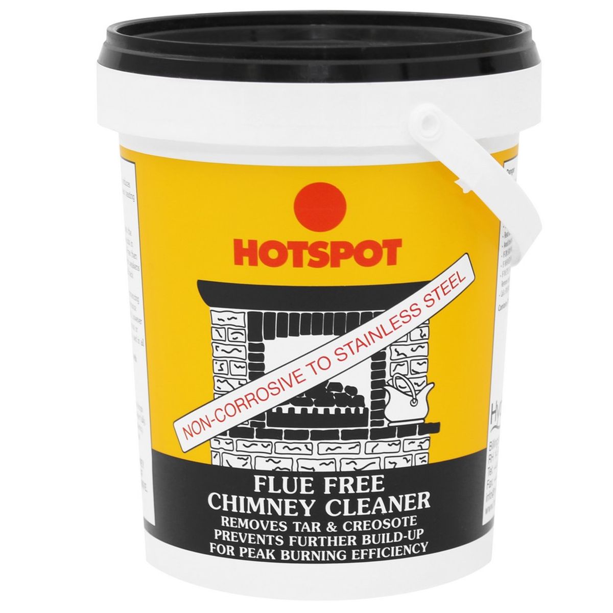The action of Hotspot flue free chimney cleaner stops and removes tar/creosote build-up, reduces risk of chimney fires, arrests chimney corrosion and maintains clean heating surfaces for maximum efficiency.