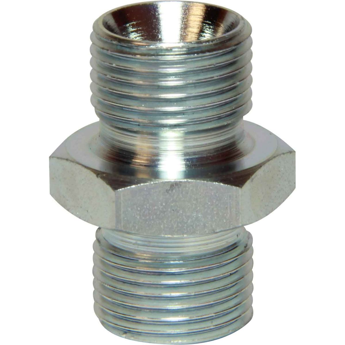 These Seaflow straight union fittings have two male ports and are constructed from steel in a parallel orientation.