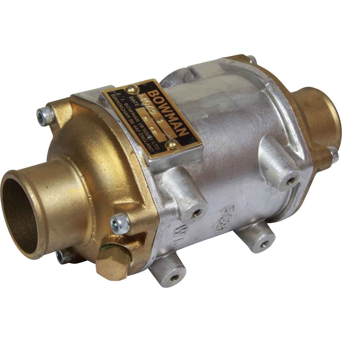 This Bowman EC80 oil cooler is designed to cool engine oil. The connection for the oil tube is 1/2″ BSP female, and the raw water connection is a straight naval brass end cap for a 45mm inside diameter hose. The cooler has a tubestack that is constructed from copper nickel and end caps made of naval brass. The oil cooler measures 190mm in length and has an outside diameter of 100mm.