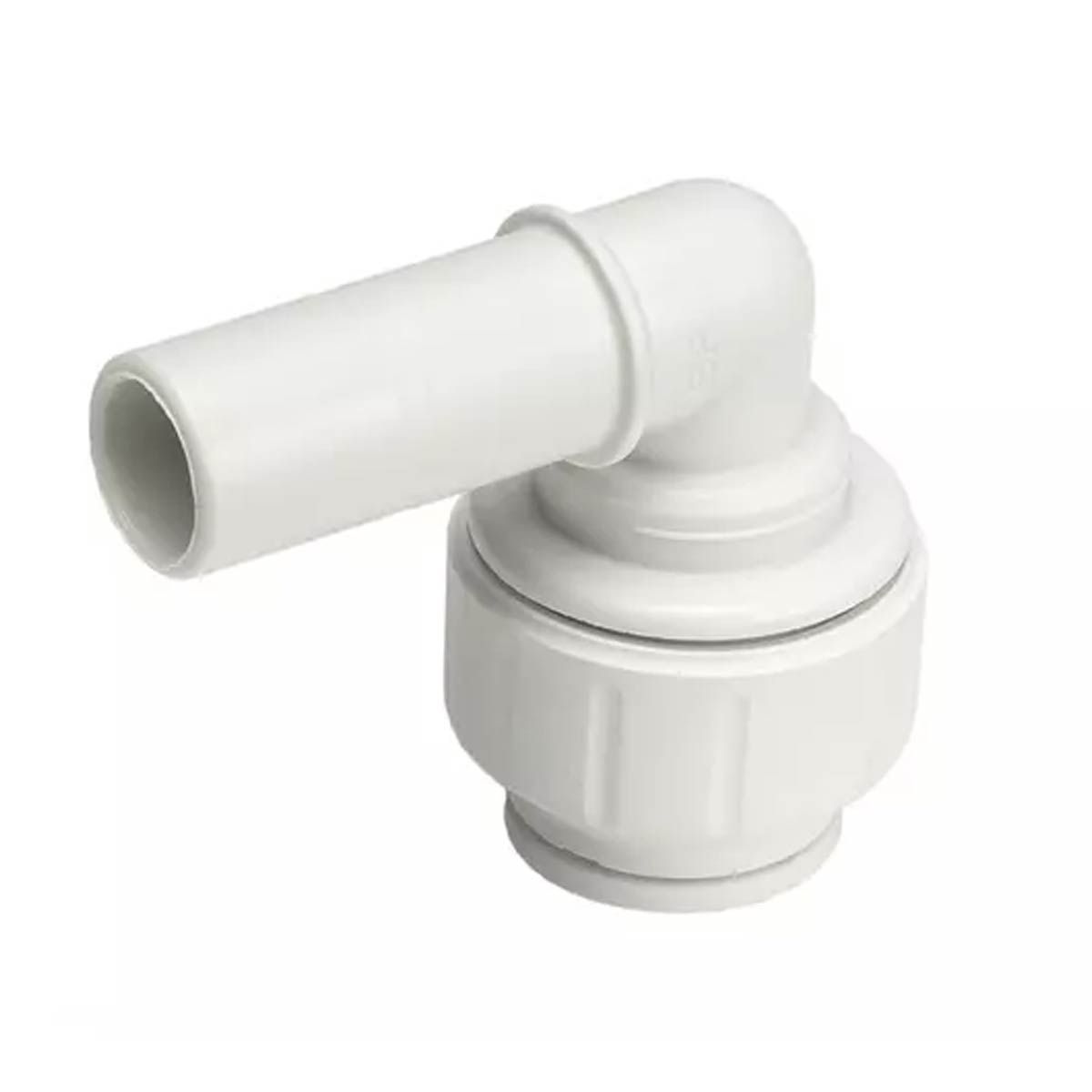 JG Speedfit stem elbow push-fit fitting for the connection of two equal sized Speedfit push-fit fittings to create a 90¡ swivel type connection. The stem elbow allows a 90¡ male to female connection making it an ideal coupler for appliances such as cold water storage tanks. Simply push the push-fit fitting fully onto the pipe and twist the plastic nut clockwise to lock in place. To demount the connection, unlock the nut by hand and push the collet towards the body of the push-fit fitting and pull the pipe to release.