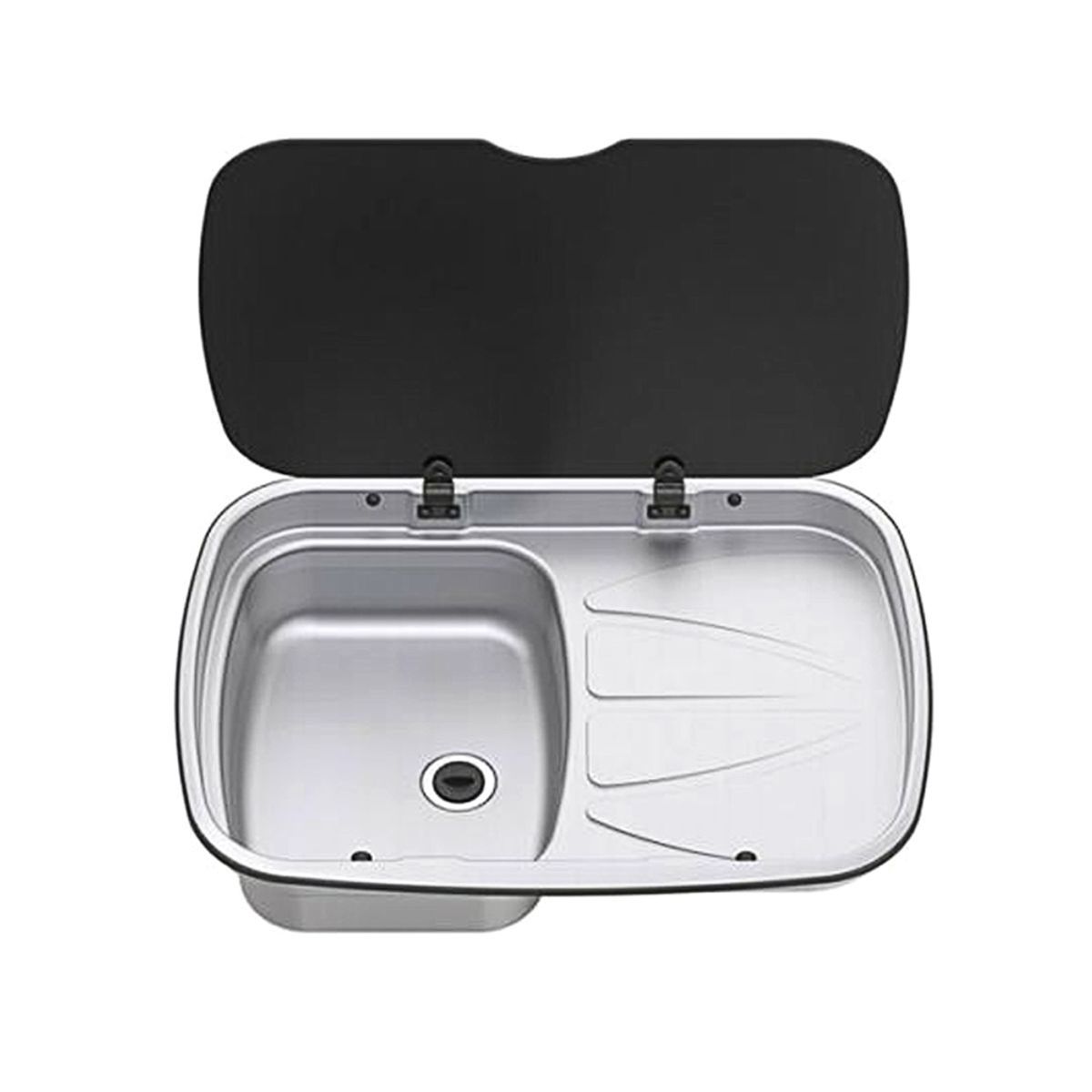Thetford 9 litre capacity stainless steel sink and draining board unit with a black glass lid that provides extra worktop space when closed.