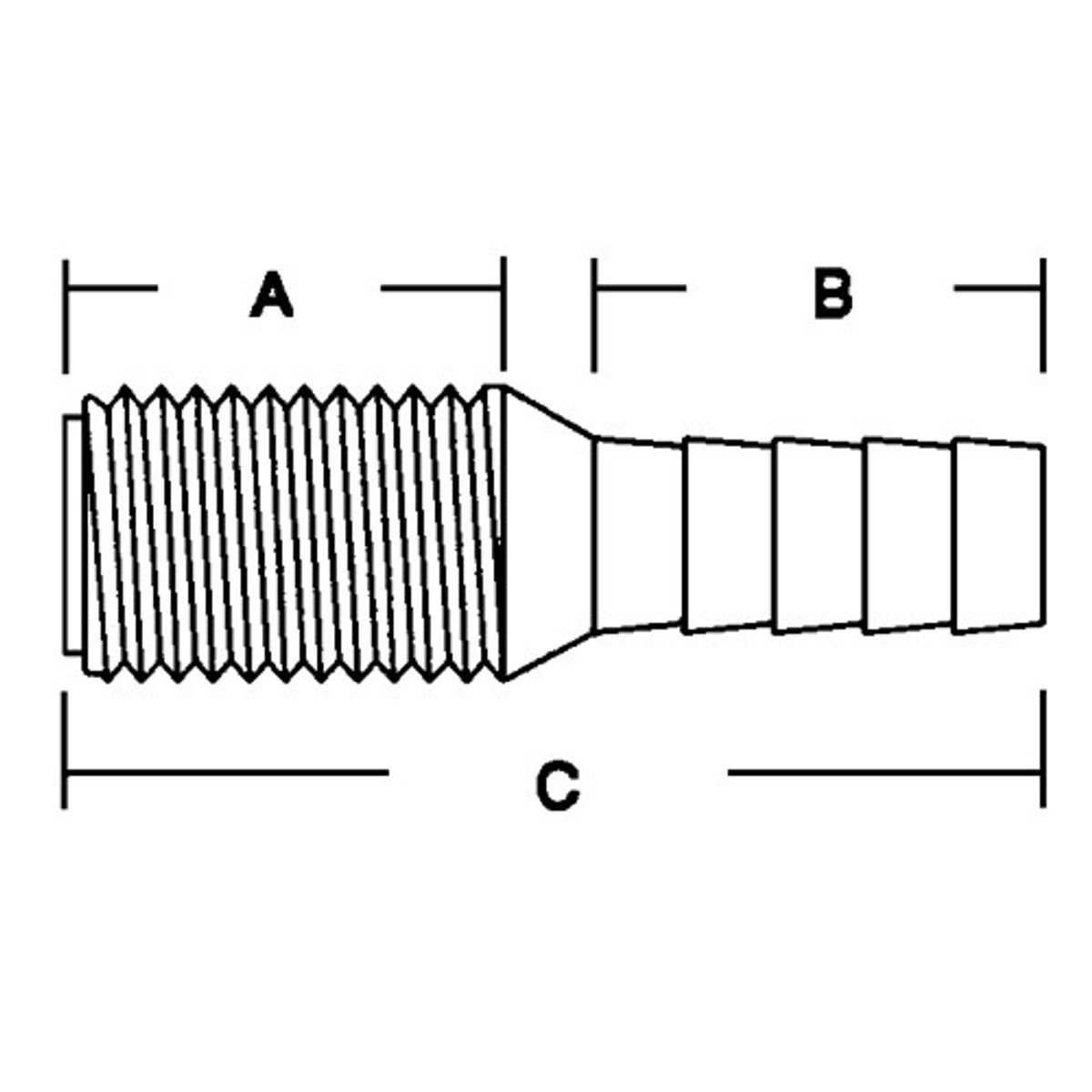 Forespar straight hose tail connector made of glass reinforced Marelon polymer. The hose tail union features a 1/2″ BSP Male threaded connection one end and a 5/8″ hose tail connection the other end.