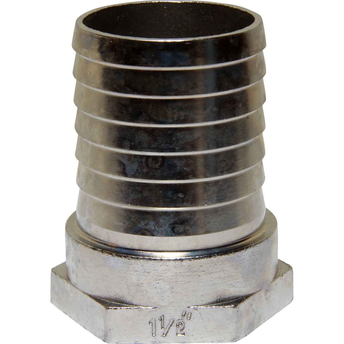 Osculati straight hose tail fitting made from stainless steel 316. This material is the marine grade stainless steel making it suitable for exposure to sea water. This hose tail connects a 1-1/2″ BSP threaded pipe to a 45mm hose connection and includes a hexagonal shoulder.