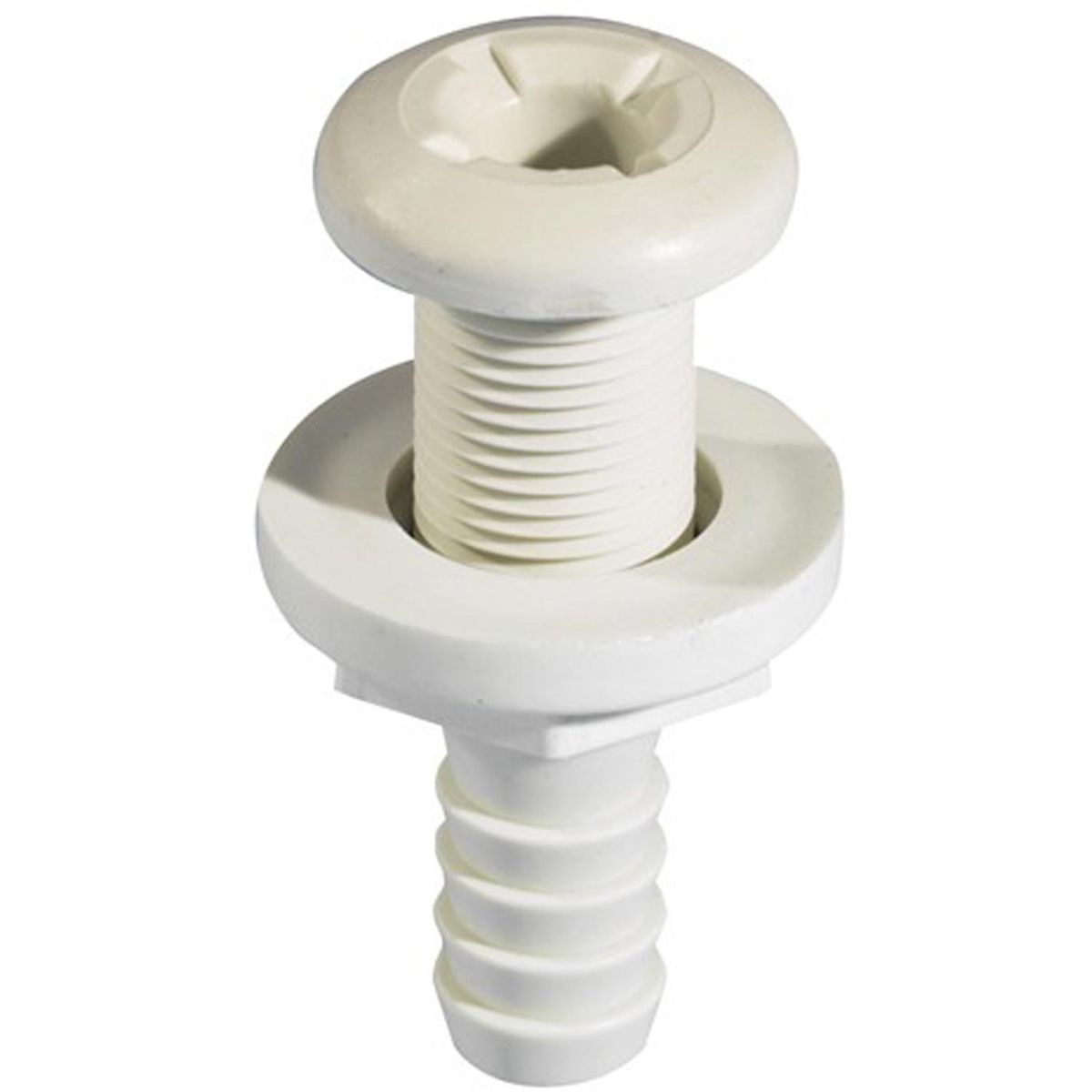 Whale SF5131 skin fitting made in strong, high-quality moulded white plastic (acetal) with 19mm (3/4″) hose tail. This skin fitting is only suitable for use above the waterline due to its construction, but it represents an inexpensive alternative through hull skin fitting for these applications. It features a non-corrosive flanged head. The Whale skin fitting connects to a hose and is designed for through hull applications.