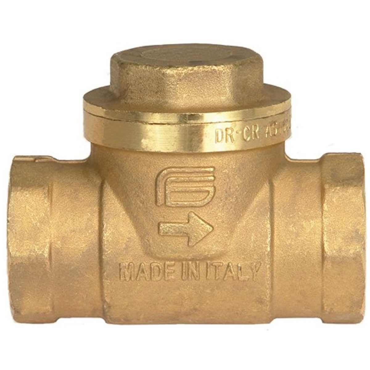 AG swing check valve with 1″ BSP female ports, full bore high flow rate and a heavy duty DZR brass high corrosion resistance construction. The valve upper plug allows cleaning and maintenance and a flow direction arrow is indicated on valve body. Horizontal mounting position.
