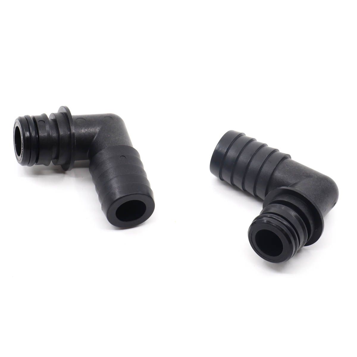 A pair of Flojet 90 degree hose tail elbows for 3/4″ (19mm) inside diameter hose and Quad port connection, for Flojet pumps. Supplied complete with EPDM O-rings.