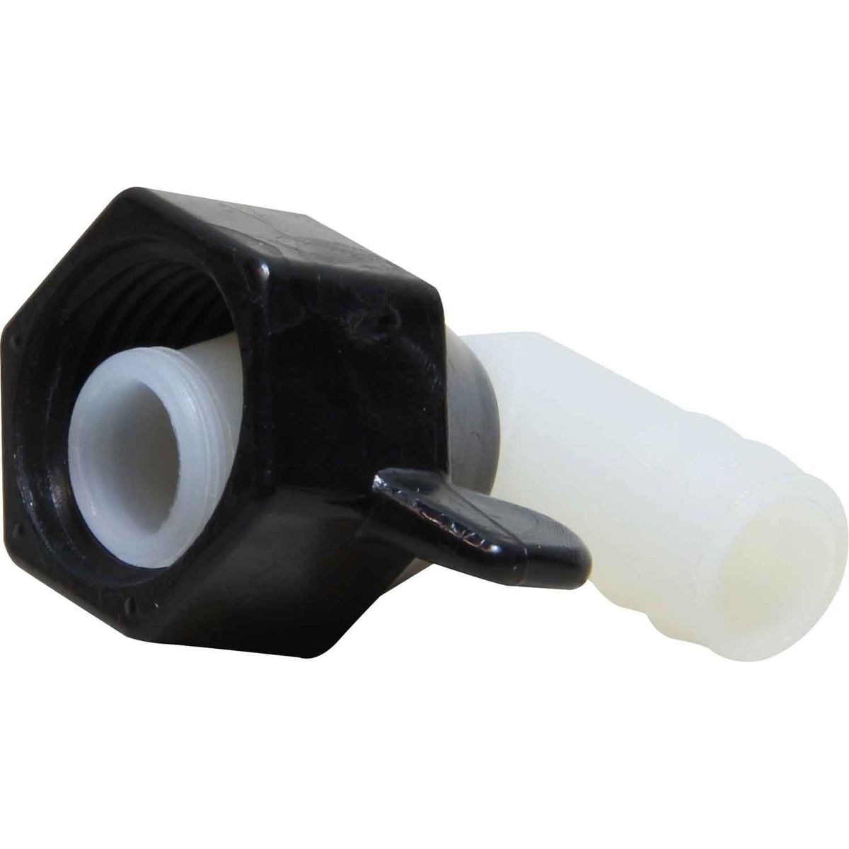 Shurflo wing nut 90 degree hose tail fitting for Shurflo pumps constructed from nylon, 1/2″ NPT Female x 1/2″ Hose tail barb (13mm).