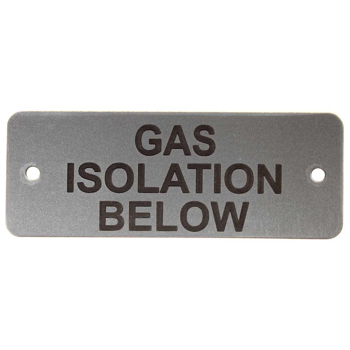 Silver ‘Gas Isolation Below’ label with white engraving and two drill holes.