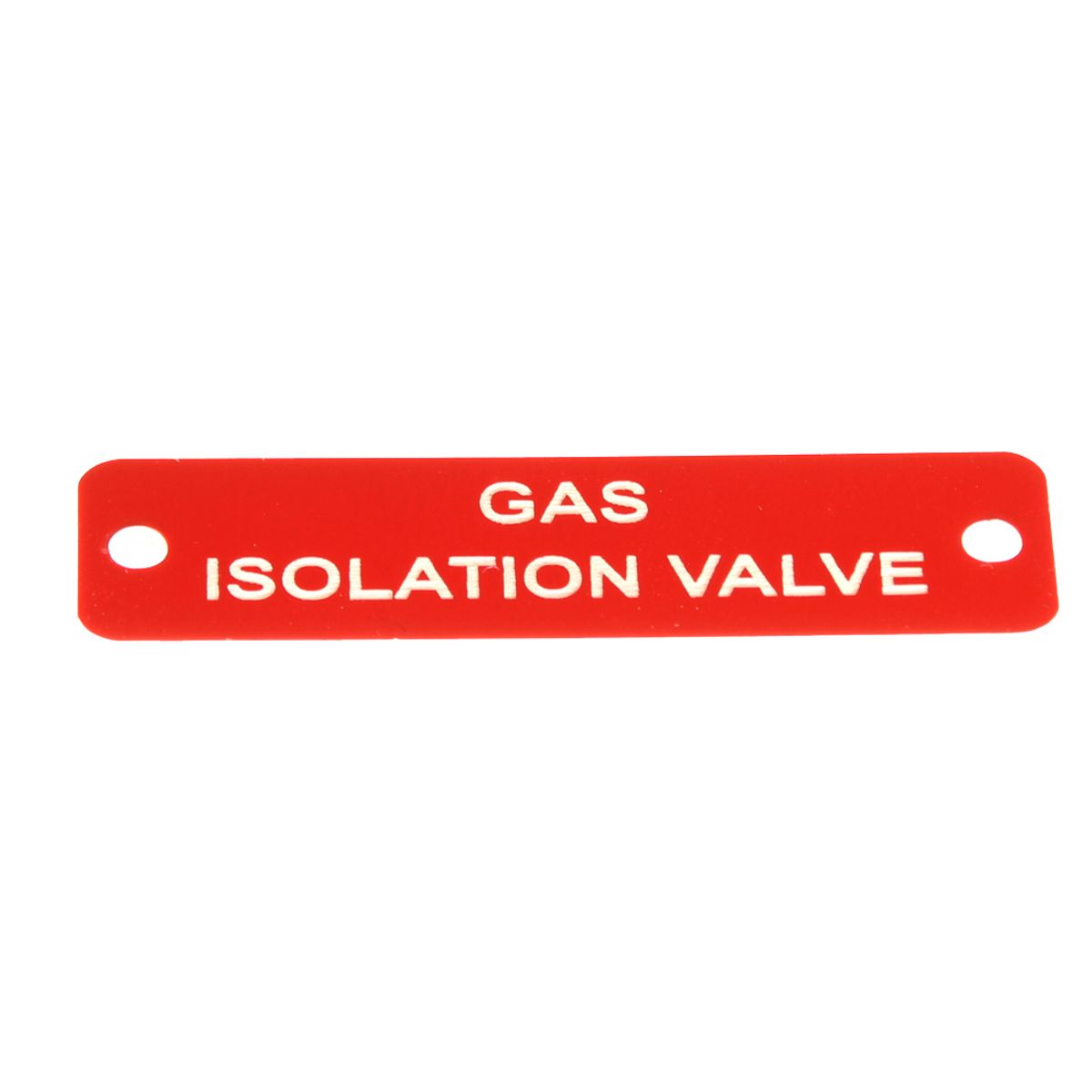 Red ‘Gas Isolation Valve’ label with white engraving and two drill holes.